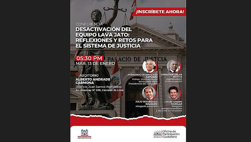 El Congreso de la República realizará este martes 13 de enero la conferencia “Desactivación del Equipo Lava Jato: reflexiones y retos para el sistema de justicia”, con el objetivo de propiciar un análisis técnico e institucional sobre los efectos de esta medida en el ámbito judicial y anticorrupción del país.
