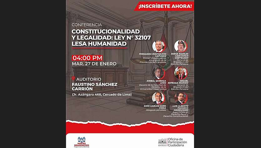 Este martes 27 de enero, el Congreso de la República será escenario de la conferencia “Constitucionalidad y legalidad: Ley Nº 32107 – Lesa Humanidad”, un espacio académico que busca promover el análisis jurídico riguroso y el debate plural en torno a una norma de alto impacto nacional.