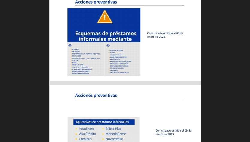 La SBS detalló además las acciones en curso: campañas de alerta, denuncias coordinadas con el Ministerio Público y la PNP, pedidos de bloqueo a Google, e implementación de la nueva normativa que regula el registro de empresas de préstamo y casas de cambio (Resolución SBS Nº 650-2024).